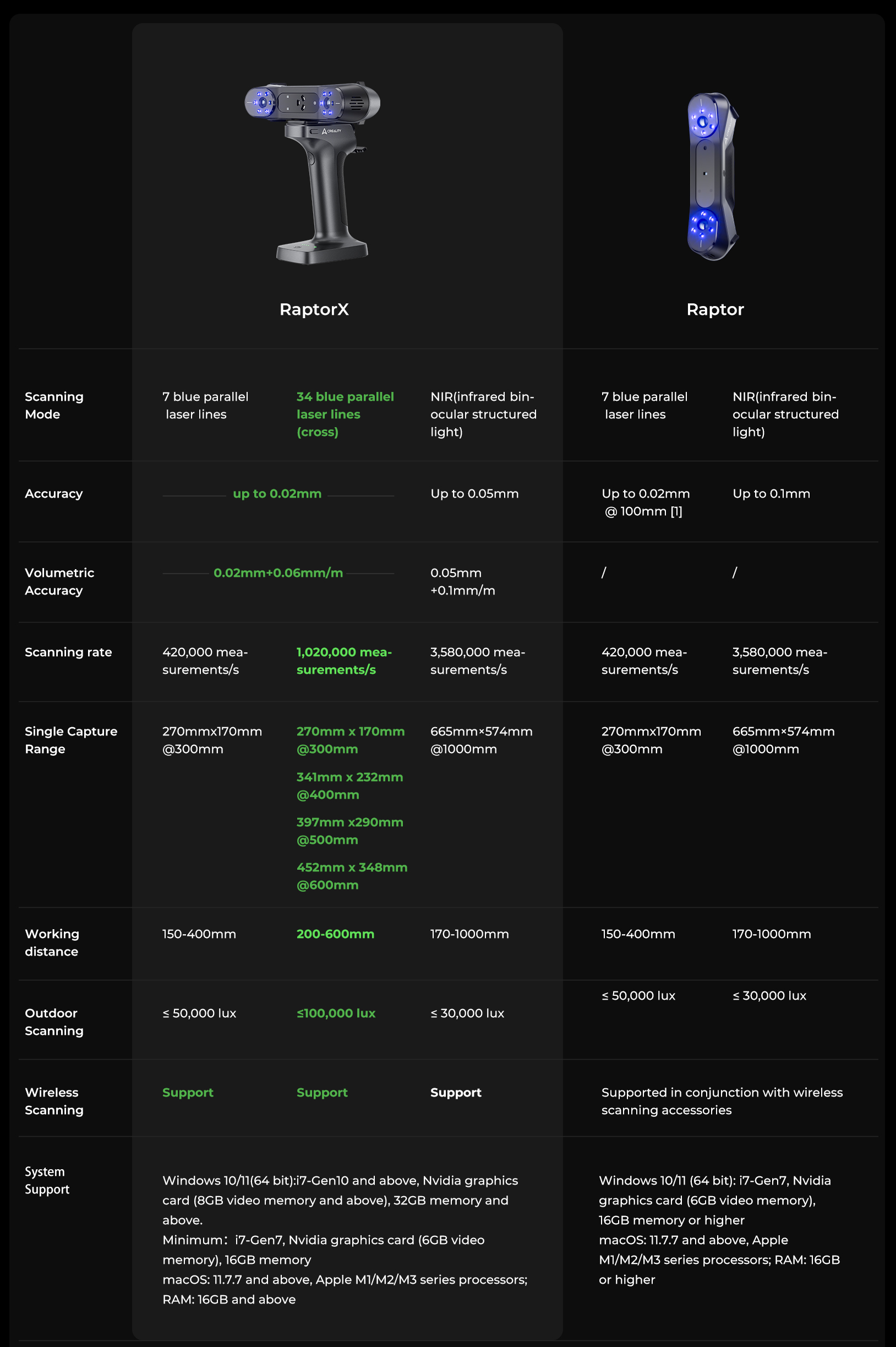 Designed for professional use, the RaptorX is highly versatile, allowing you to scan objects as small as 5mm and as large as 4 meters with ease. It is ideal for scanning black and metallic objects without the need for sprays and can handle both indoor and outdoor environments thanks to its blue laser’s strong environmental resistance. Whether you’re scanning engineering parts, automobile components, molds, or human bodies, the RaptorX ensures precision and efficiency.